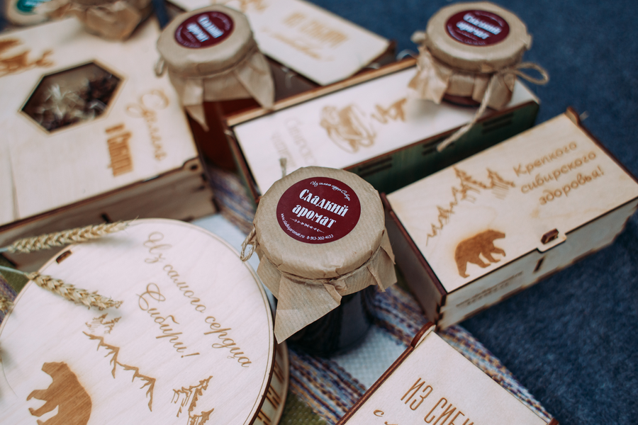 Все это, конечно, дополнено баночкой ароматного мёда, крем-мёда, варенья, душистого иван-чая, красивыми свечами из натурального воска, цукатами из сосновых шишек и кедровыми орешками.